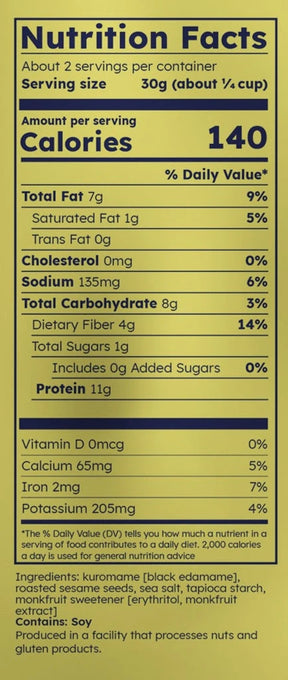 Ingredients: Kuromame [black Edamame], Roasted Sesame Seeds, Sea Salt, Tapioca Starch, Monkfruit Sweetener [erythritol, Monkfruit Extract]. Contains Soy.