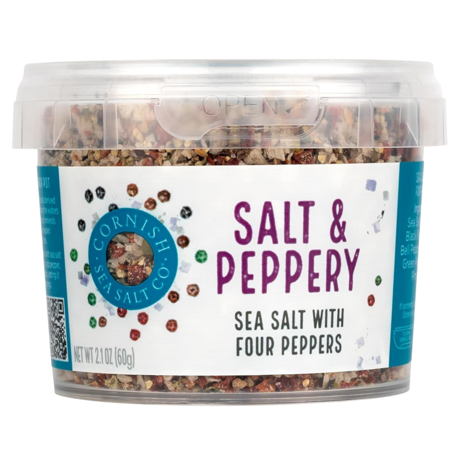 The Salt & Peppery Seasoning blends their signature sea salt flakes with a bold medley of cracked black and green peppercorns, red pepper, and pimento for elevated everyday flavor.-