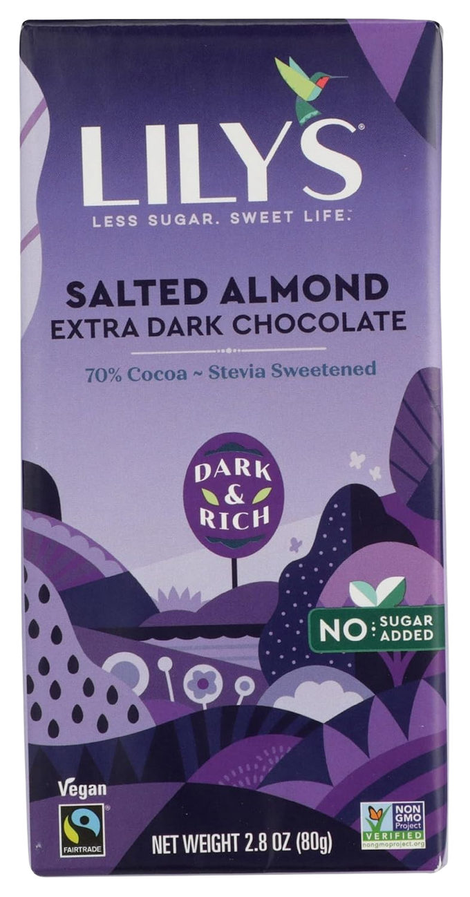 Made with 70-percent cacao, this salted almond extra dark chocolate style sweets bar is also gluten free, kosher certified and free of added sugars.
