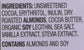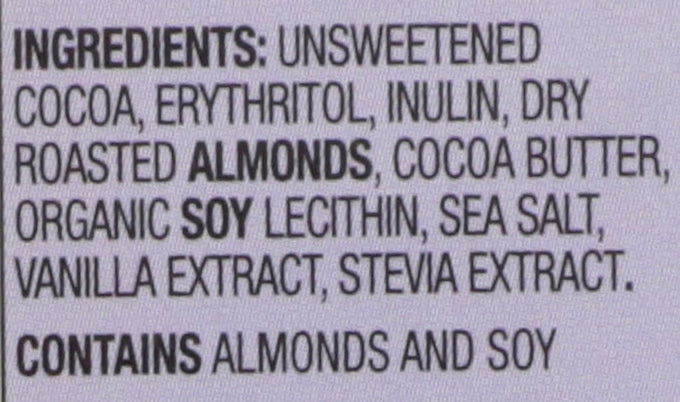Ingredients: Unsweetened Cocoa, Erythritol, Inulin, Dry Roasted Almonds, Cocoa Butter, Organic Soy Lecithin, Sea Salt, Vanilla Extract, Stevia Extract.