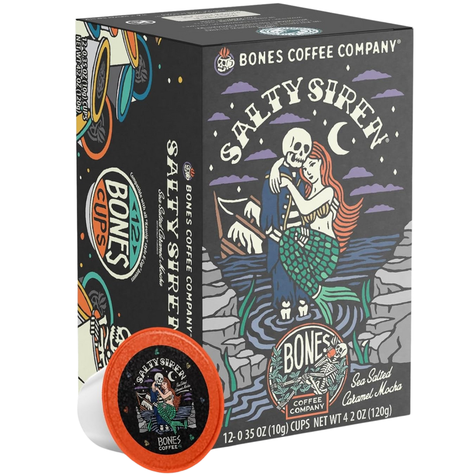 The Salty Siren Bones Kcup Coffee Pods blend rich caramel, smooth chocolate, and a touch of sea salt for a brew that’s irresistibly enchanting.