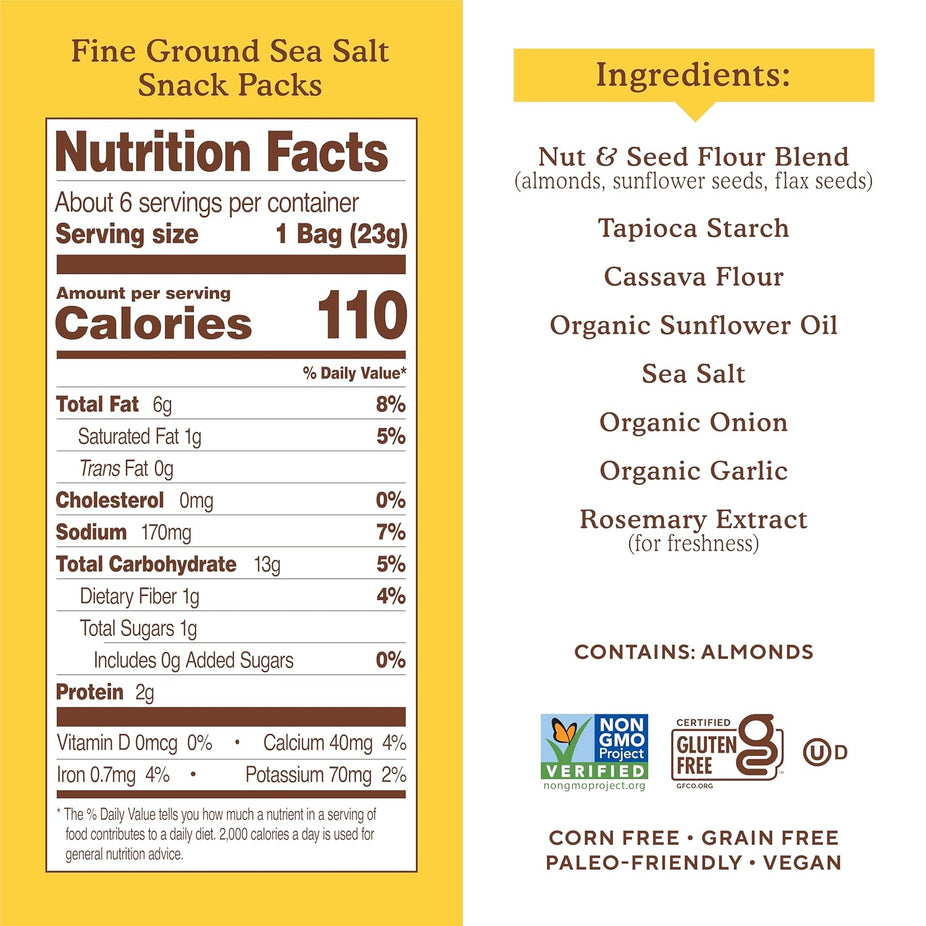 Ingredients: Nut and Seed Flour Blend (almond flour, sunflower seeds, flax seeds), Tapioca Starch, Cassava, Organic Sunflower Oil, Sea Salt, Organic Onion, Organic Garlic, Rosemary Extract (for freshness)
