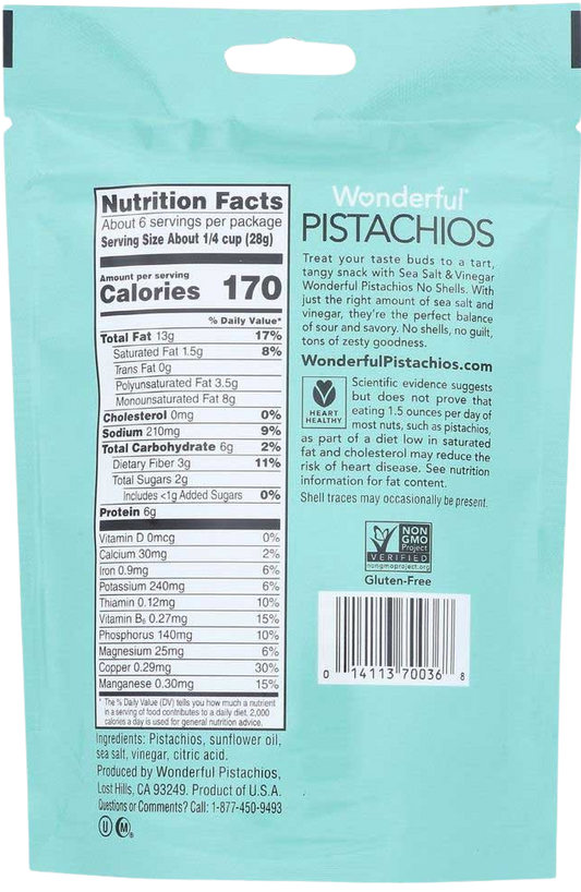 Ingredients: Pistachios, sunflower oil, sea salt, vinegar, citric acid