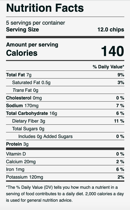 Ingredients: Chickpea Tortilla Chick (Chickpea Flour, White Corn Flour, Yellow Corn Flour, Pea Hull Fiber), Canola Oil And/or Sunflower Oil Sea Salt.