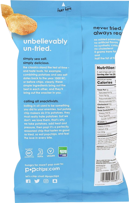 Popchips Sea Salt Potato Chips offer a light and crispy snack experience with just the right touch of sea salt. Made using a unique popping process, these chips are never fried and contain far less fat than traditional potato chips. Perfect for a quick snack or pairing with your favorite dip, they deliver a satisfying crunch and savory flavor in every bite.
