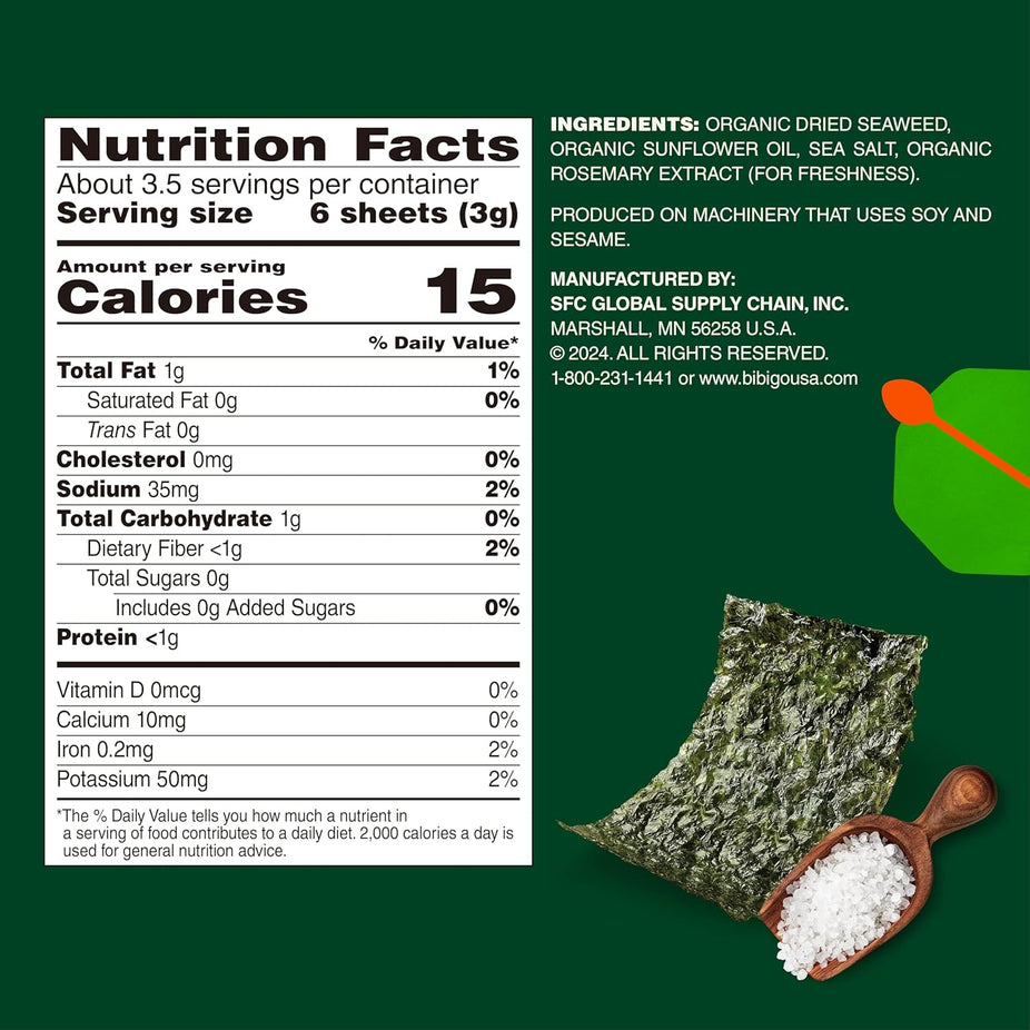 Ingredients: ORGANIC DRIED SEAWEED, ORGANIC SUNFLOWER OIL, SEA SALT, ORGANIC ROSEMARY EXTRACT (FOR FRESHNESS). PRODUCED ON MACHINERY THAT USES SOY AND
