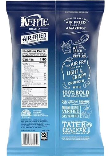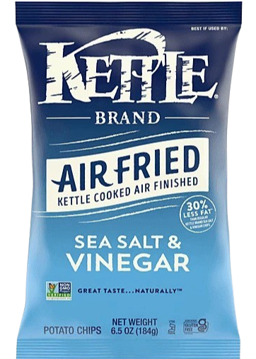 Kettle Brand Air Fried Sea Salt & Vinegar Kettle Chips are kettle cooked, air-fried chips that delivers a light and crispy crunch with no compromise on taste and texture. Their balanced flavor of sea salt and tongue-puckering vinegar deliver 100% bold Kettle Brand flavor with 30% less fat than our regular Kettle Brand Sea Salt & Vinegar Chips. Delight your taste buds with our take on this flavorful favorite. When you open a bag of our Kettle Brand potato chips, you know you're getting incredible kettle chips made with authentic recipes by real people. From their farms to our kitchens and then to your home, the time and attention every Kettle Brand worker puts into their products is care you can trust. All that, plus Kettle Brand Air Fried chips deliver a delicious snack that’s Non-GMO Project Verified and Certified Gluten Free. This 6.5-ounce bag of chips is perfect for sharing at parties, tailgates, or just snacking on the couch.