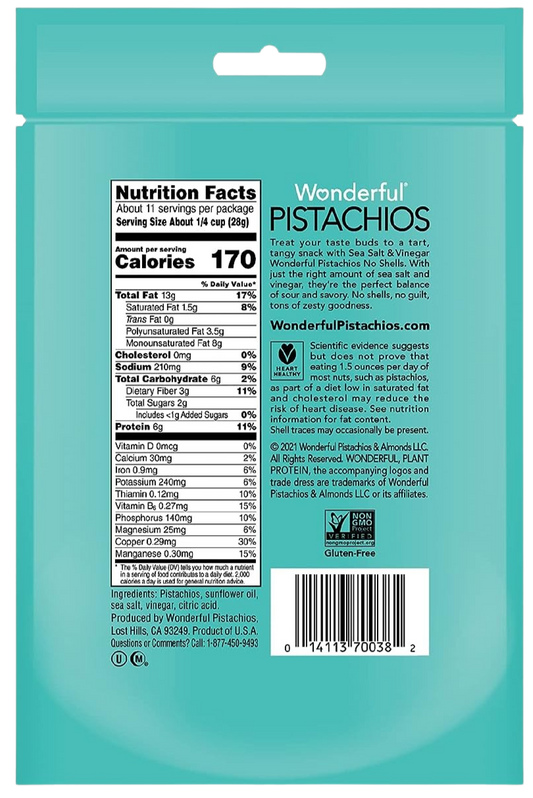 Ingredients: Pistachios, sunflower oil, sea salt, vinegar, citric acid