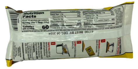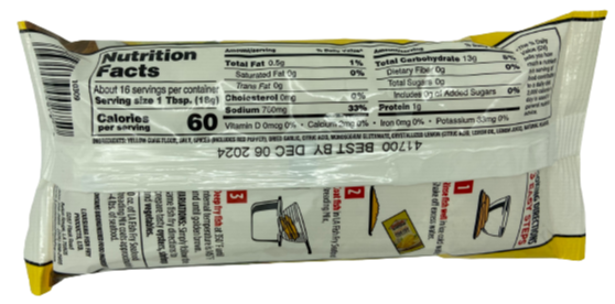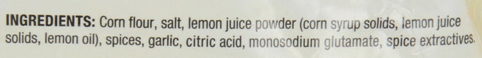 Ingredients: Yellow Corn Flour, Salt, Spiced (Includes Red Pepper), Dried Garlic, Citric Acid, Monosodium Glutamate, Crystallized Lemon (Citric Acid, Lemon Oil, Lemon Juice), Natural Flavor