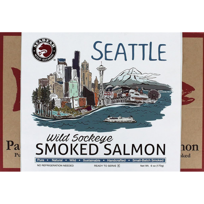 The Seattle Skyline Smoked Sockeye Salmon is a gourmet delicacy, carefully smoked and packaged for ultimate freshness.