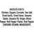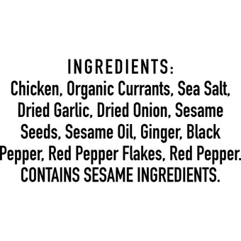 Ingredients: Natural* Chicken, Organic Currants, Sea Salt, Garlic, Onion, Sesame Seeds, Sesame Oil, Ginger, Black Pepper, Red Pepper Flakes, Red Pepper