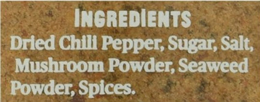 Ingredients: Dried Chili Pepper, Sugar, Salt, Mushroom Powder, Seaweed Powder, Spices