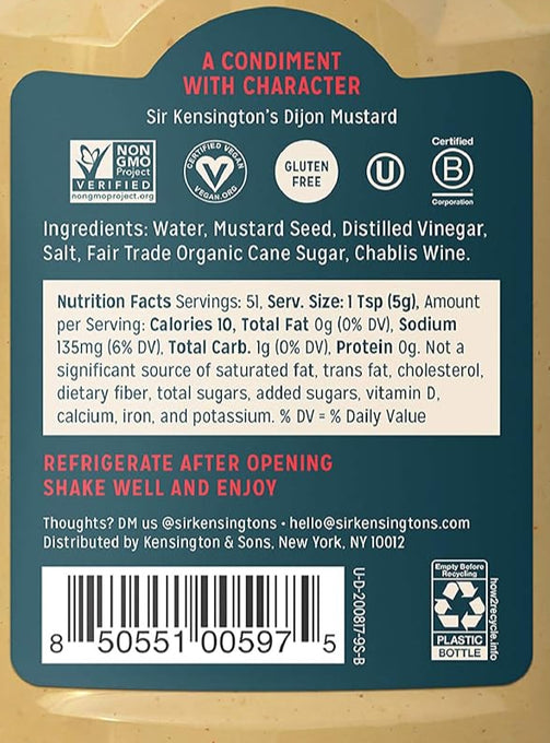 A homage to a French classic, Sir Kensington's Dijon Mustard proves rich and potent, with pleasing heat and balanced acidity. Finely milled for a creamy texture, the density of flavor is mellowed with Chablis.