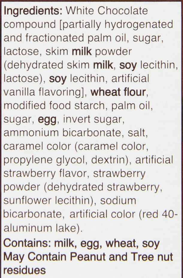 Ingredients: White Chocolate Compound [(Palm Kernel Oil, Palm Oil, Fully Hydrogenated Rapeseed Oil), Sugar, Lactose, Whey Powder Demineralized, Skim Milk Powder, Lecithin], Wheat Flour, Corn Starch, Shortening (Refined Palm Oil, Refined Palm Stearin, Refined Palm Kernel Oil, Emulsifier (Distilled Mono Glycerides),vitamin E (Anti-oxidant)), White Sugar, Whole Egg, Invert Sugar, Calcium Carbonate, Ammonium Bicarbonate (Leavening Agent), Salt, Artificial Strawberry Flavor, Caramel Color (Caramel Color, Maltodextrin, Propylene Glycol), Citric Acid, Strawberry Powder, Sodium Bicarbonate (Leavening Agent), Artificial Milk Flavor, Fdc Red #40 Lake Coloring, Artificial Vanilla Flavor.