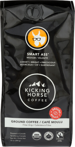 Kicking horse smart ass grounds knows how to dish up a warm welcome. It's a half-full cup of wake up and wise up. No joke here, this is just a bright, chocolaty concoction for the smart-thinking, deep-drinking, good-at-their-game-in-the-morning crowd. This blend brings the aroma of sweet syrup, vanilla bean and stone fruit with flavor notes of sugar cane and milk chocolate with a honeyed berry body. Our coffee is certified kosher, fair trade and usda organic. Contains one 10 oz. Bag of smart ass coffee grounds. In 1996, in the rocky mountain town of invermere, b.c., canada, elana rosenfeld and leo johnson began roasting coffee in their garage. Some days they got down to their skivvies to beat the heat. Some days they balanced babies on their hips. Every day found them experimenting with the best methods to make kick ass coffee.