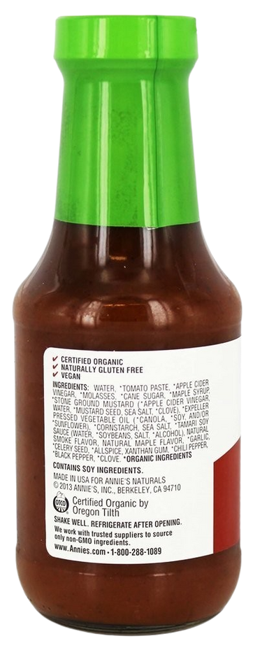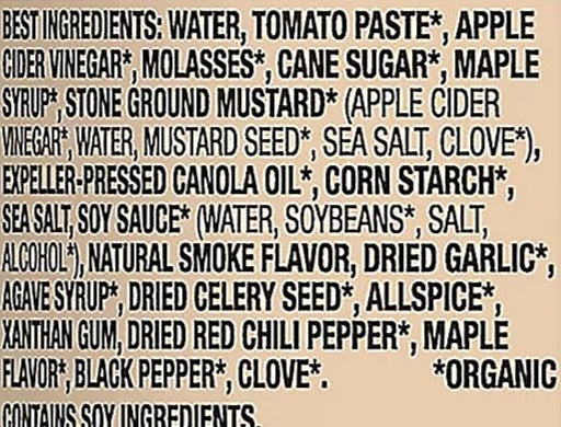 Ingredients: Water, Organic Tomato Paste, Organic Apple Cider Vinegar, Organic Molasses, Organic Cane Sugar, Organic Maple Syrup, Organic Stone Ground Mustard (Organic Apple Cider Vinegar, Water, Organic Mustard Seed, Sea Salt, Organic Clove), Organic Expeller-Pressed Canola Oil, Organic Corn Starch, Sea Salt, Organic Soy Sauce (Water, Organic Soybeans, Salt, Organic Alcohol), Natural Smoke Flavor, Organic Dried Garlic, Organic Agave Syrup, Organic Dried Celery Seed, Organic Allspice, Xanthan Gum, Organic Dried Red Chili Pepper, Organic Maple Flavor, Organic Black Pepper, Organic Clove