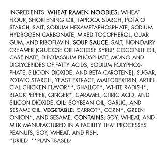 Ingredients: Wheat Flour, Shortening Oil, Tapioca Starch,Potato Starch, Salt, Sodium Hexametaphosphate, Sodium Hydrogen Carbonate, Mixed Tocopherol, Guar Gum, And Riboflavin, Soup Sauce: Salt, Non-Dairy Creamer (Glucose Or Lactose Syrup, Coconut Oil, Caseinate, Dipotassium Phosphate, Mono And Diglycerides Of Fatty Acids, Sodium Polyphosphate, Silicone Dioxide And Beta Carotene), Sugar, Potato Starch, Yeast Extract, Maltodextrin, Artificial Chicken Flavor (Plant Based), Shallot (Dried), White Raddish (Dried), Black Pepper, Ginger (Dried), Caramel, Citric Acid, And Silicone Dioxide, Oil: Soybean Oil, Garlic, And Sesame Oil, Vegetable: Carrot (Dried), Corn (Dried), Green Onion (Dried) And Sesame.