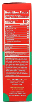 Ingredients: Gluten Free Flour Blend (Organic Light Buckwheat Flour, Cassava Flour, Gluten Free Oat Flour, Tapioca Flour), Non Gmo Sunflower Oil, Organic Fair Trade Cane Sugar, Semi-Sweet Chocolate Chips (Cane Sugar, Unsweetened Chocolate, Cocoa Butter), Organic Light Brown Sugar (Organic Cane Sugar, Organic Molasses), Water, Tapioca Starch, Tapioca Syrup, Dutched Cocoa, Fructose, Tapioca Fiber Syrup, Baking Soda, Sea Salt, Peppermint Extract, Rosemary Extract.