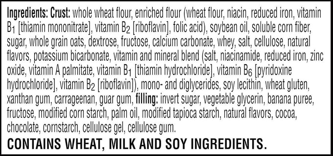 Ingredients: Crust: Whole Wheat Flour, Enriched Flour (Wheat Flour, Niacin, Reduced Iron, Vitamin B1 [thiamin Mononitrate], Vitamin B2 [riboflavin], Folic Acid), Soybean Oil, Soluble Corn Fiber, Sugar, Whole Grain Oats, Dextrose, Fructose, Calcium Carbonate, Whey, Salt, Cellulose, Natural Flavors, Potassium Bicarbonate, Vitamin And Mineral Blend (Salt, Niacinamide, Reduced Iron, Zinc Oxide, Vitamin A Palmitate, Vitamin B1 [thiamin Hydrochloride], Vitamin B6 [pyridoxine Hydrochloride], Vitamin B2 [riboflavin]), Mono- And Diglycerides, Soy Lecithin, Wheat Gluten, Xanthan Gum, Carrageenan, Guar Gum, Filling: Invert Sugar, Vegetable Glycerin, Banana Puree, Fructose, Modified Corn Starch, Palm Oil, Modified Tapioca Starch, Natural Flavors, Cocoa, Chocolate, Cornstarch, Cellulose Gel, Cellulose Gum.