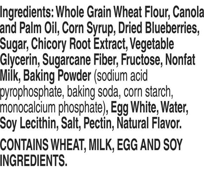 Ingredients: Whole Grain Wheat Flour, Canola And Palm Oil, Corn Syrup, Dried Blueberries, Sugar, Chicory Root Extract, Vegetable Glycerin, Sugarcane Fiber, Fructose, Nonfat Milk, Baking Powder (Sodium Acid Pyrophosphate, Baking Soda, Corn Starch, Monocalcium Phosphate), Egg White, Water, Soy Lecithin, Salt, Pectin, Natural Flavor.