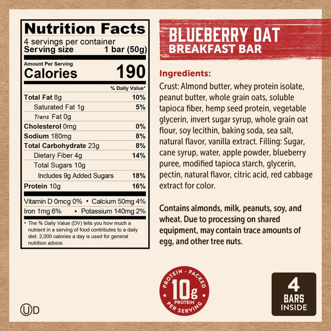 Ingredients: Crust: Almond Butter, Whey Protein Isolate, Peanut Butter, Whole Grain Oats, Soluble Tapioca Fiber, Hemp Seed Protein, Vegetable Glycerin, Invert Sugar Syrup, Whole Grain Oat Flour, Soy Lecithin, Baking Soda, Sea Salt, Natural Flavor, Vanilla Extract. Filling: Sugar, Cane Syrup, Water, Apple Powder, Blueberry Puree, Modified Tapioca Starch, Glycerin, Pectin, Natural Flavor, Citric Acid, Red Cabbage Extract For Color.