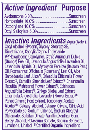 Ingredients: Avobenzone 3.0% Purpose Sunscreen Homosalate 10.0% Purpose Sunscreen Octocrylene 10.0% Purpose Sunscreen Octyl Salicylate 5.0% Purpose Sunscreen","Water (Aqua), Cetyl Alcohol, Glycerin, Glyceryl Stearate Se, Dimethicone, Caprylic/Capric Triglyceride, Vp/Hexadecene Copolymer, Citrus Aurantium Dulcis (Orange) Peel Oil, Lavandula Angustifolia (Lavender) Oil, Lavandula Hybrida Oil, Myroxylon Pereirae (Balsam Peru) Oil, Rosmarinus Officinalis (Rosemary) Leaf Oil, Aloe Barbadensis Leaf Juice?¹?, Calendula Officinalis Flower Extract?¹?, Camellia Sinensis Leaf Extract?¹?, Chamomilla Recutita (Matricaria) Flower Extract?¹?, Echinacea Angustifolia Extract?¹?, Ginkgo Biloba Leaf Extract, Lavandula Angustifolia (Lavender) Flower Extract?¹?, Panax Ginseng Root Extract, Tocopheryl Acetate, Alcohol?¹?, Cetearyl Alcohol, Cetearyl Olivate, Citric Acid, Polysorbate 60, Sodium Chloride, Sodium Stearoyl Glutamate, Sorbitan Olivate, Vanillin, Xanthan Gum, Benzyl Alcohol, Potassium Sorbate, Sodium Benzoate, Limonene, Linalool.