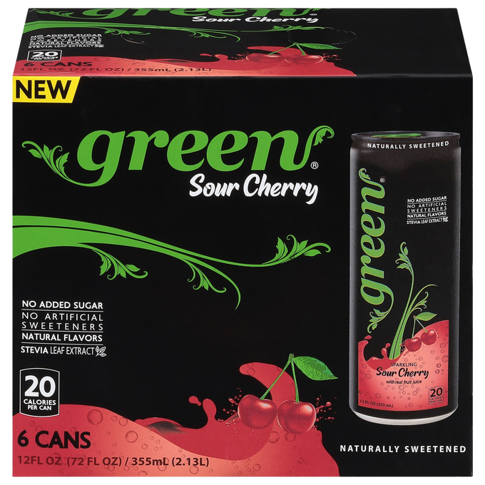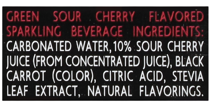 Ingredients: Green Sour Cherry Flavored Sparkling Beverage: Carbonated Water, 10% Sour Cherry Juice (From Concentrated Juice), Black Carrot (Color), Citric Acid, Stevia Leaf Extract, Natural Flavorings.