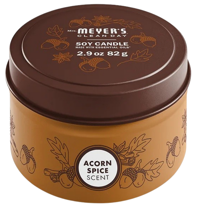 The Mrs. Meyer’s Clean Day Soy Tin Candle in Acorn Spice fills your space with cozy, autumnal comfort in a charming, reusable tin.