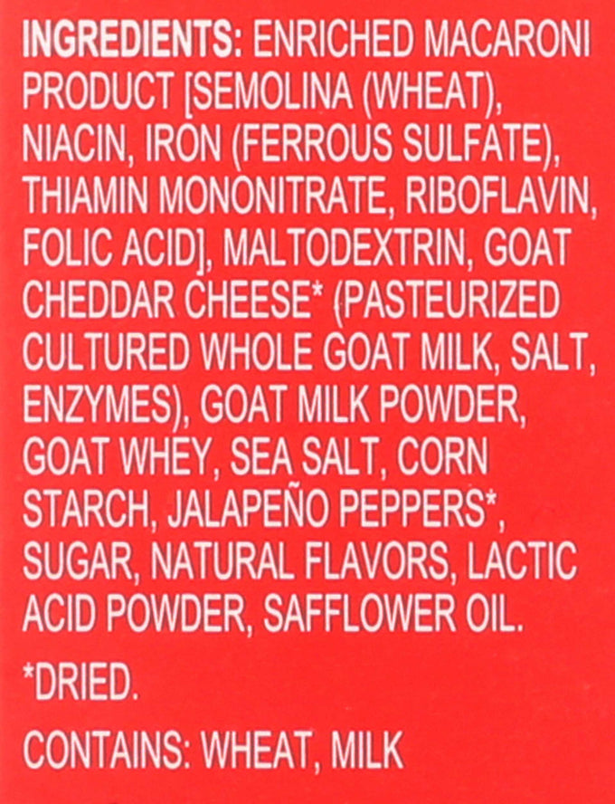 Ingredients: Enriched Macaroni [semolina (Wheat), Niacin, Iron (Ferrous Sulfate), Thiamin Mononitrate, Riboflavin, Folic Acid), Maltodextrin, Goat Milk Powder, Goat Cheddar Cheese (Dried) (Pasteurized Cultured Whole Goat Milk, Salt, Cheese Culture, Enzymes), Sea Salt, Cornstarch, Jalapeno Peppers (Dried), Cane Sugar Natural Flavors, Lactic Acid Powder, Sodium Phosphate.