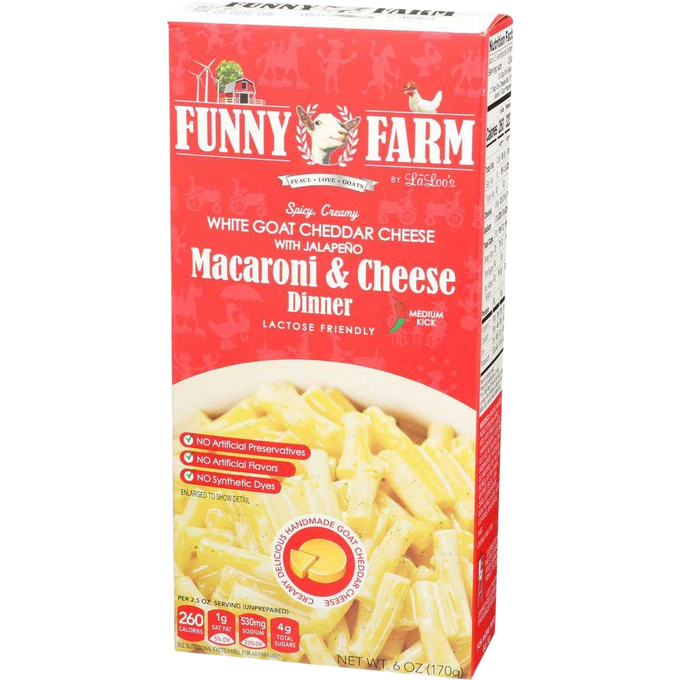 Funny farm by laloo's white goat cheddar cheese with jalapeno macaroni & cheese dinner puts a spicy twist on an old favorite. Enjoy the creamy, cheesy flavor with a medium kick of spice paired with your favorite meat dish for a quick and easy side to complete your meal