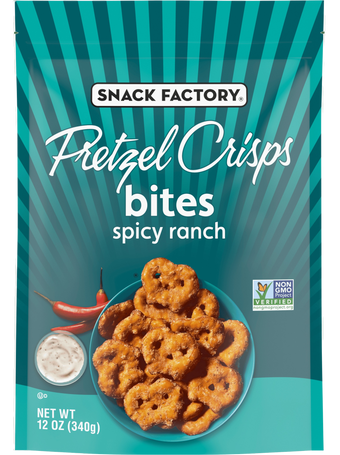 Snack Factory Spicy Ranch Pretzel Crisps Bites are perfectly poppable, bite-sized treats packed with a deliciously seasoned kick.