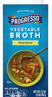 Progresso Vegetarian Vegetable Broth will add the delectable taste of vegetables to your next recipe. Enjoy the bold, delicious flavors of gluten-free vegetable broth in your next homemade soup, stew, roast, casserole or slow cooker recipe.