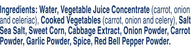 Ingredients: Water, Vegetable Juice Concentrate (carrot, onion and celeriac), Cooked Vegetables (carrot, onion and celery), Salt, Sea Salt, Sweet Corn, Cabbage Extract, Onion Powder, Carrot Powder, Garlic Powder, Spice, Red Bell Pepper Powder.