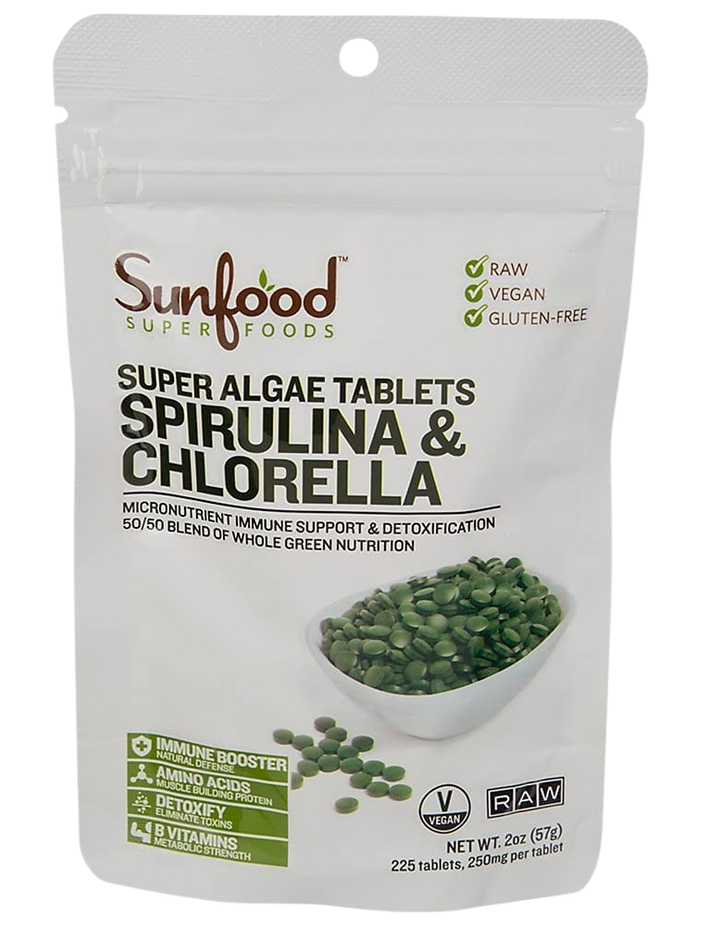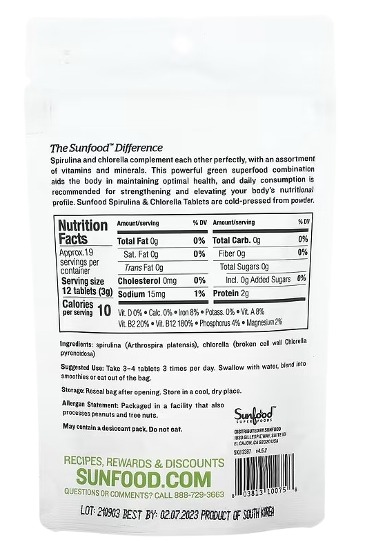 Ingredients: Spirulina (arthrospira platensis), chlorella (broken cell wall chlorella pyrenoidosa).Allergen Statement: Packaged in a facility that also processes peanuts and tree nuts.