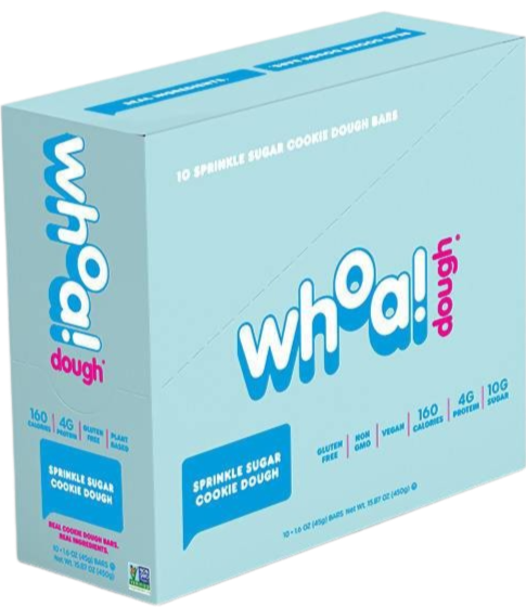Whoa Dough Sprinkled Sugar Cookie is a real cookie dough bar. Real ingredients. With a mosaic of organic sprinkles, our plant-based, dairy free, soy free, gluten free and guilt free Sprinkle Sugar Cookie Dough Bar is a decedent Whoa Dough flavor. OU kosher and vegan, Whoa Dough only uses the highest-quality ingredients to create an on-the-go cookie dough bar that satisfies your cravings and regales in indulgence. With a 12 month shelf life, you can skip the fridge. Whoa Dough bars won’t melt in your pocket; they’ll melt in your mouth. Each bar has 4g protein, 3g fiber, 10g sugar, and only 160 calories.