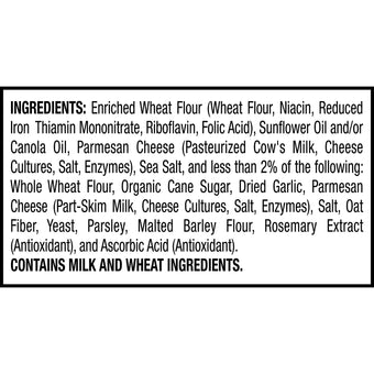 Ingredients: Enriched Wheat Flour (Wheat Flour, Niacin, Reduced Iron, Thiamin Mononitrate, Riboflavin, Folic Acid), Sunflower Oil And/Or Canola Oil, Parmesan Cheese (Pasteurized Cow'S Milk, Cheese Cultures, Salt, Enzymes), Sea Salt And Less Than 2% Of The Following: Whole Wheat Flour, Organic Cane Sugar, Dried Garlic, Parmesan Cheese (Part-Skim Milk, Cheese Cultures, Salt, Enzymes), Salt, Oat Fiber, Yeast, Parsley, Malted Barley Flour, Rosemary Extract (Antioxidant), And Ascorbic Acid (Antioxidant).