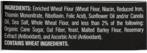Ingredients: Enriched wheat flour;wheat flour;niacin;reduced iron;thiamin mononitrate;riboflavin;folic acid;sunflower oil and/or canola oil;sea salt;whole wheat flour;and less than 2% of the following: organic cane sugar;oat fiber;yeast;malted barley flour;rosemary extract;antioxidant;and ascorbic acid
