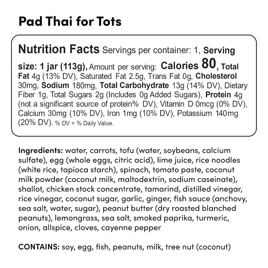 Ingredients: Water, Carrots, Tofu (Water, Soybeans, Calcium Sulfate), Egg (Whole Eggs, Citric Acid), Lime Juice, Rice Noodles (White Rice, Tapioca Starch), Spinach, Tomato Paste, Coconut Milk Powder (Coconut Milk, Maltodextrin, Sodium Caseinate), Shallot, Chicken Stock Concentrate, Tamarind, Distilled Vinegar, Rice Vinegar, Coconut Sugar, Garlic, Ginger, Fish Sauce (Anchovy, Sea Salt, Water, Sugar), Peanut Butter (Dry Roasted Blanched Peanuts), Lemongrass, Sea Salt, Smoked Paprika, Turmeric, Onion, Allspice, Cloves, Cayenne Pepper. Contains: Soy, Egg, Peanuts, Milk, Tree Nut (Coconut).