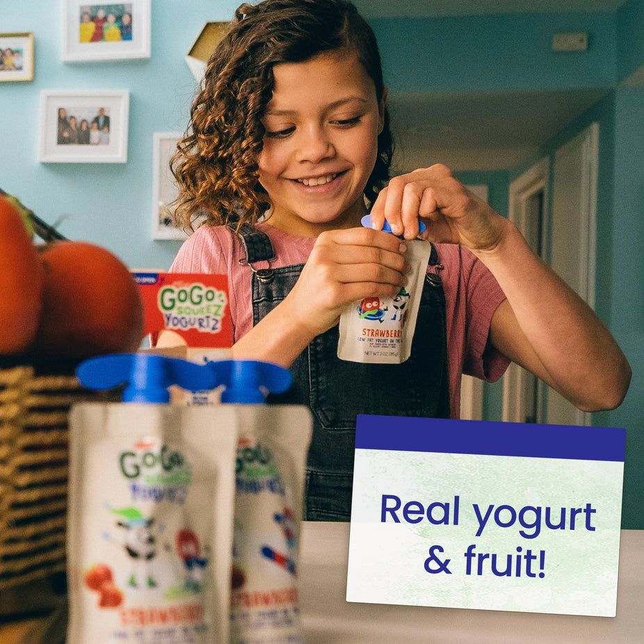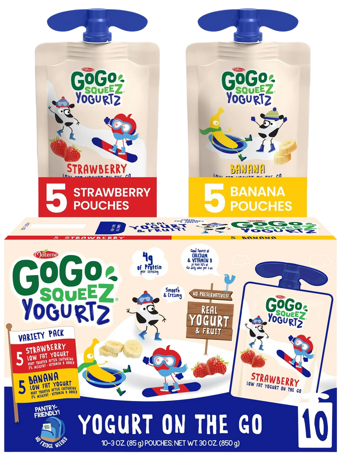 Ingredients: Strawberry: Cultured Reduced Fat Milk, Cane Sugar, Strawberry Puree Concentrate, Fruit Pectin, Tapioca Starch, Natural Flavors, Vitamin D2. Banana: Cultured Reduced Fat Milk, Cane Sugar, Banana Puree Concentrate, Fruit Pectin, Tapioca Starch, Natural Flavors, Vitamin D2.