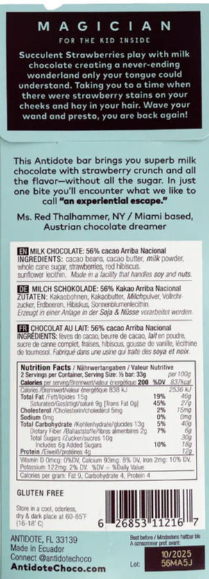 Antidote is redefining chocolate indulgence with bold flavors, premium ingredients, and a focus on mindful sweetness. The Strawberry + Hibiscus Chocolate Bar is a luxurious fusion of creamy milk chocolate, tangy hibiscus flowers, and the satisfying crunch of freeze-dried strawberries.