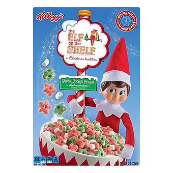 Kids can start their day like a Scout Elf with a bowl of Kellogg's The Elf on the Shelf Sugar Cookie Cereal, the official cereal of the North Pole. Originally crafted in the North Pole Sweet Shop, Mrs. Claus' special recipe calls for a scrumptious mix of star-shaped cereal pieces and marshmallows, bursting with delicious, fresh-baked sugar cookie flavor fit for a Scout Elf. This seasonal treat features red and green, star-shaped cereal pieces and soft white marshmallows that pair well with magical holiday moments. Each serving helps elves and children alike get a strong start, whether they're headed to the North Pole or just the local sledding hill, with a good source of 7 vitamins and minerals and no high fructose corn syrup. The magical fun of Kellogg's The Elf on the Shelf Sugar Cookie Cereal makes a great addition to a complete breakfast and anytime snacking occasions. Just add your favorite milk or enjoy straight from the box.