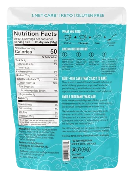 Ingredients: Almond Flour, Monkfruit Sweetener (Erythritol, Monk Fruit Extract), Resistant Tapioca Starch, Sugarcane Fiber, Tapioca Fiber, Ceullulose, Psyllium Husk, Natural Flavors, Baking Powder, Sea Salt, Baking Soda. Contains: Tree Nuts (Almonds).