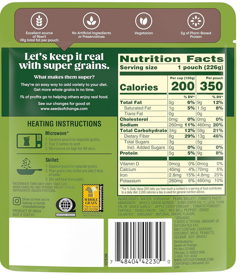 Seeds of Change Super Grains Smokey Southwest is a delicious and convenient side dish featuring a hearty mix of grains and herbs, ready in just 90 seconds.
