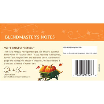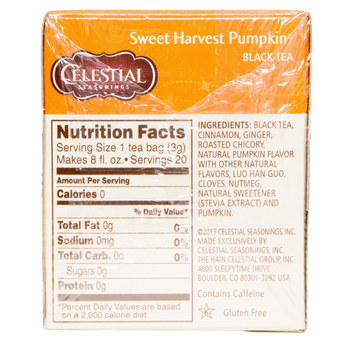 Ingredients: Black Tea, Cinnamon, Ginger, Roasted Chicory, Natural Pumpkin Flavor With Other Natural Flavors, Luo