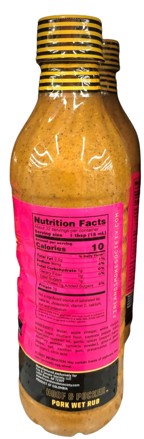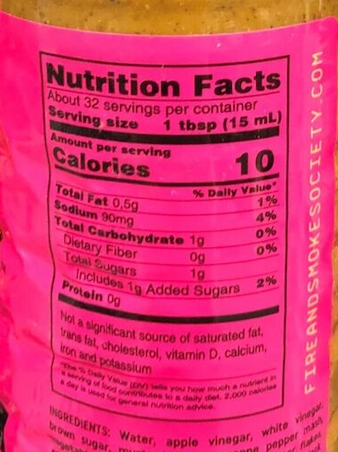 Ingredients: Water, Apple Vinegar, White Vinegar, Brown Sugar, Mustard Flour, Cayenne Pepper Mash, Vegetable Soybean Oil, Garlic, Spices (Pepper Flakes, Rosemary Powder, Turmeric Powder), Ground Black Pepper, Salt, Xanthan Gum, Preservative (Sodium Benzoate), Citric Acid.