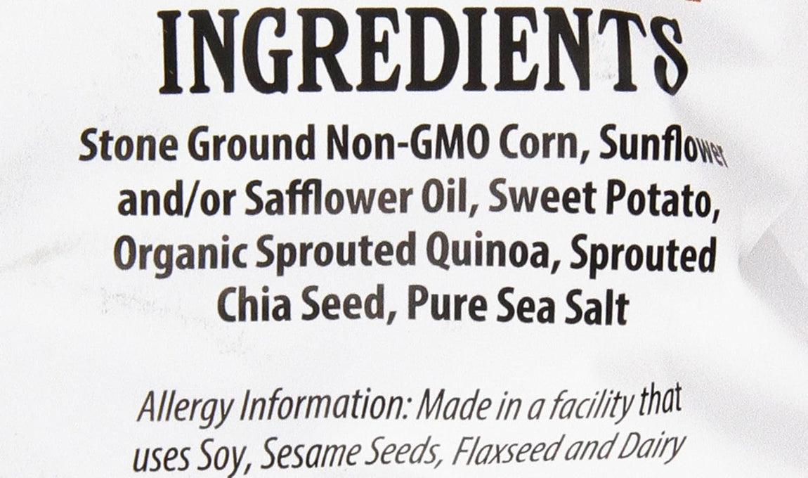 Ingredients: Non-gmo Stone Ground Whole Corn, Sunflower Oil, Sweet Potato, Sprouted Seed And Grain Blend [sprouted Quinoa, Sprouted Chia Seed), Pure Sea Salt.