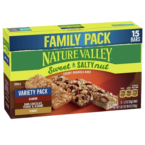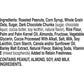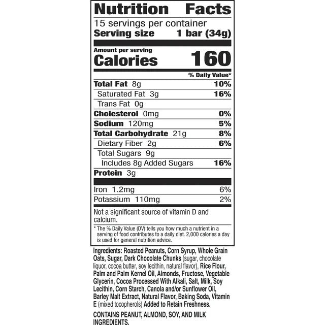 Ingredients: Roasted Peanuts, Corn Syrup, Whole Grain Oats, Sugar, Dark Chocolate Chunks (sugar, chocolate liquor, cocoa butter, soy lecithin, natural flavor), Rice Flour, Palm and Palm Kernel Oil, Almonds, Fructose, Vegetable Glycerin, Cocoa Processed With Alkali, Salt, Milk, Soy Lecithin, Corn Starch, Canola and/or Sunflower Oil, Barley Malt Extract, Natural Flavor, Baking Soda, Vitamin E (mixed tocopherols) Added to Retain Freshness.