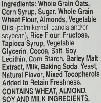 Ingredients: Whole Grain Oats, Corn Syrup, Sugar, Whole Grain Wheat Flour, Almonds, Vegetable Oils (Palm Kernel, Canola And/Or Soybean), Rice Flour, Fructose, Tapioca Syrup, Vegetable Glycerin, Cocoa, Salt, Soy Lecithin, Corn Starch, Barley Malt Extract, Milk, Baking Soda, Yeast, Natural Flavor, Mixed Tocopherols Added To Retain Freshness.