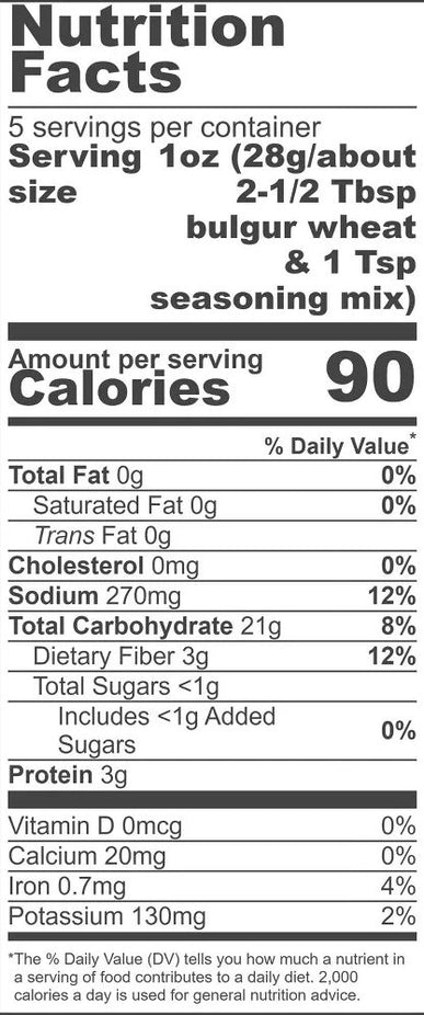 Ingredients: Bulgur Wheat, Salt, Parsley (Dried), Onions, Molasses (Dried), Garlic, Spearmint, Honey, Black Pepper.
