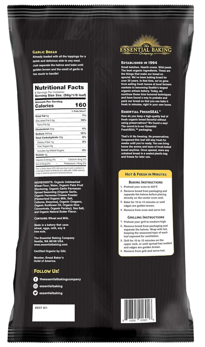 Ingredients: Organic Unbleached Wheat Flour, Water, Organic Palm Fruit Shortening, Organic Garlic Parmesan Spread Seasoning (Organic Garlic, Organic Parmesan Cheese Powder [Pasteurized Organic Milk, Salt, Cultures, Enzymes], Organic Oregano, Organic Sunflower Oil, Organic Rice Concentrate, Organic Parsley), Sea Salt, and Organic Natural Butter Flavor.